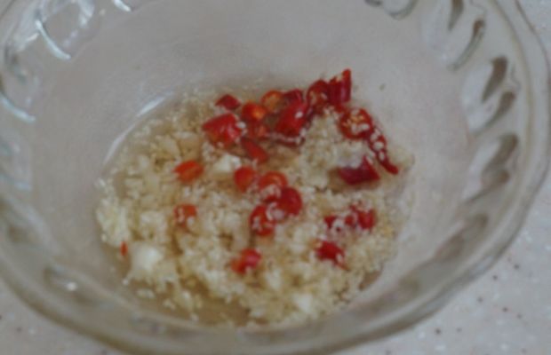 第四步 在盛辣椒末和蒜末的碗里倒入适量的芝麻油,然后锅里加热适量的玉米油倒在辣椒碗里