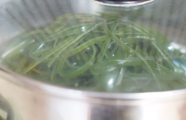 第三步 将洗净泡好的海带丝放在蒸锅里,锅里加入适量的水,开大火蒸15分钟左右,蒸好之后取出晾凉