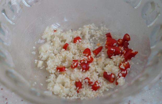 第二步 准备好小红辣椒和大蒜,将它们洗净切成碎末,然后放入适量的白芝麻进去,一起搅拌均匀。