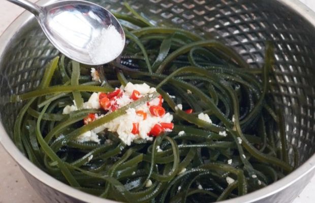 第五步 将辣椒油倒入海带碗中,加入调料汁,再放入适量的老抽、食盐、白糖和香醋调味